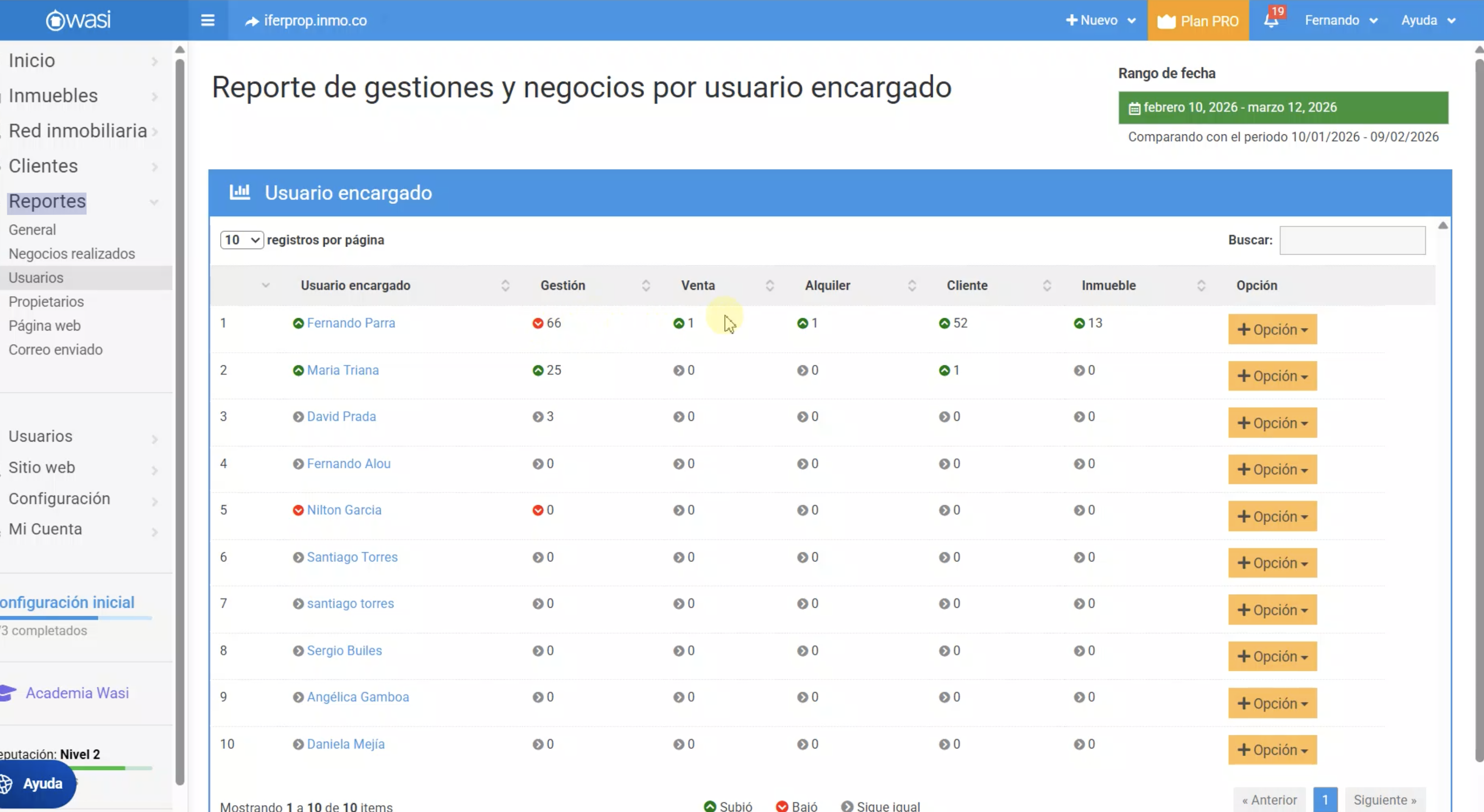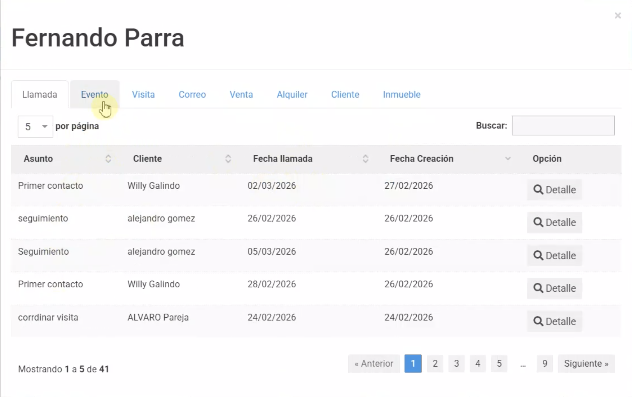 No te quedes solo en el número. Wasi te permite entrar al detalle de cada usuario para ver qué tipo de gestiones está realizando: ¿Son solo llamadas de primer contacto o hay visitas reales a los inmuebles?