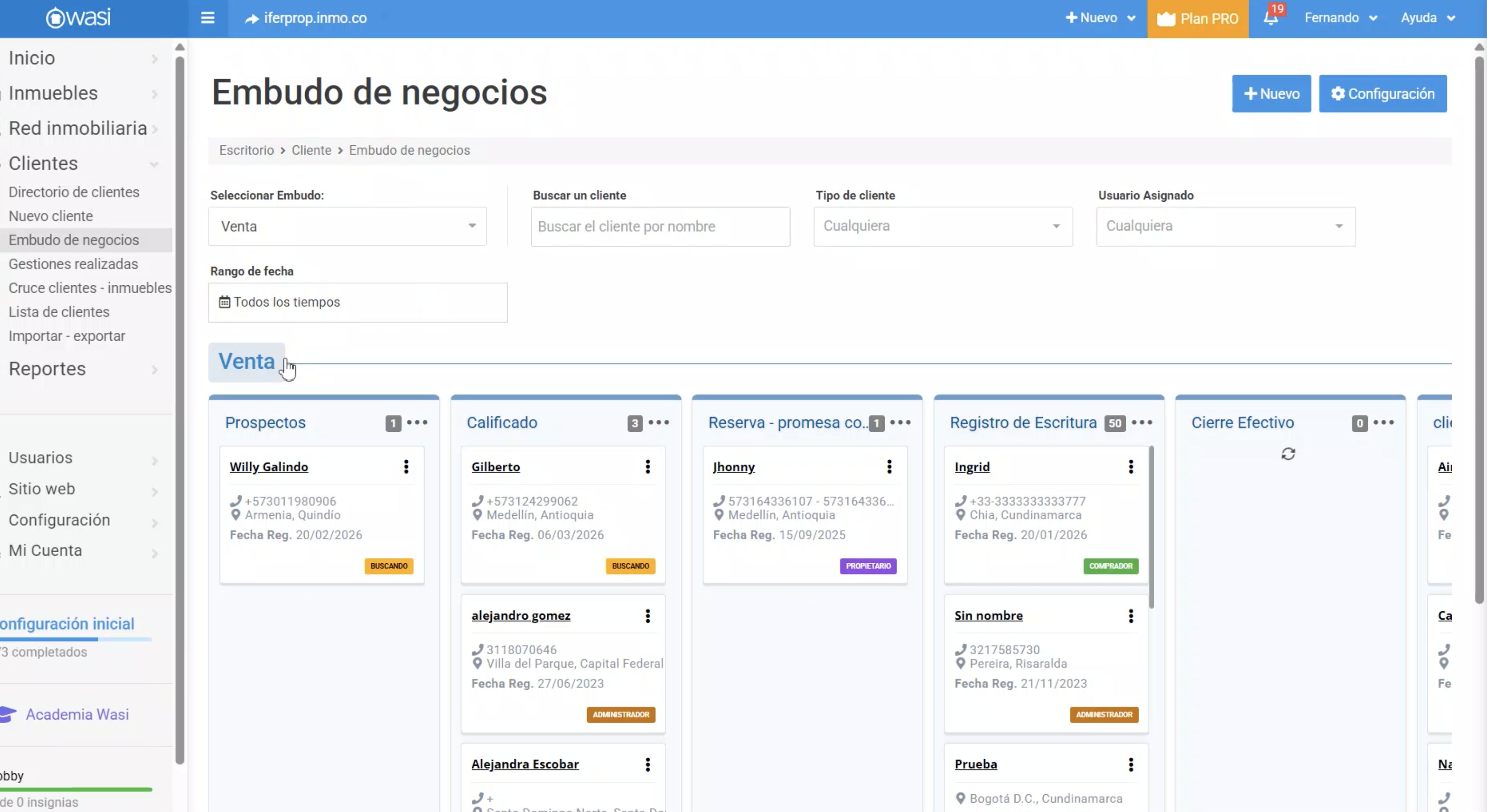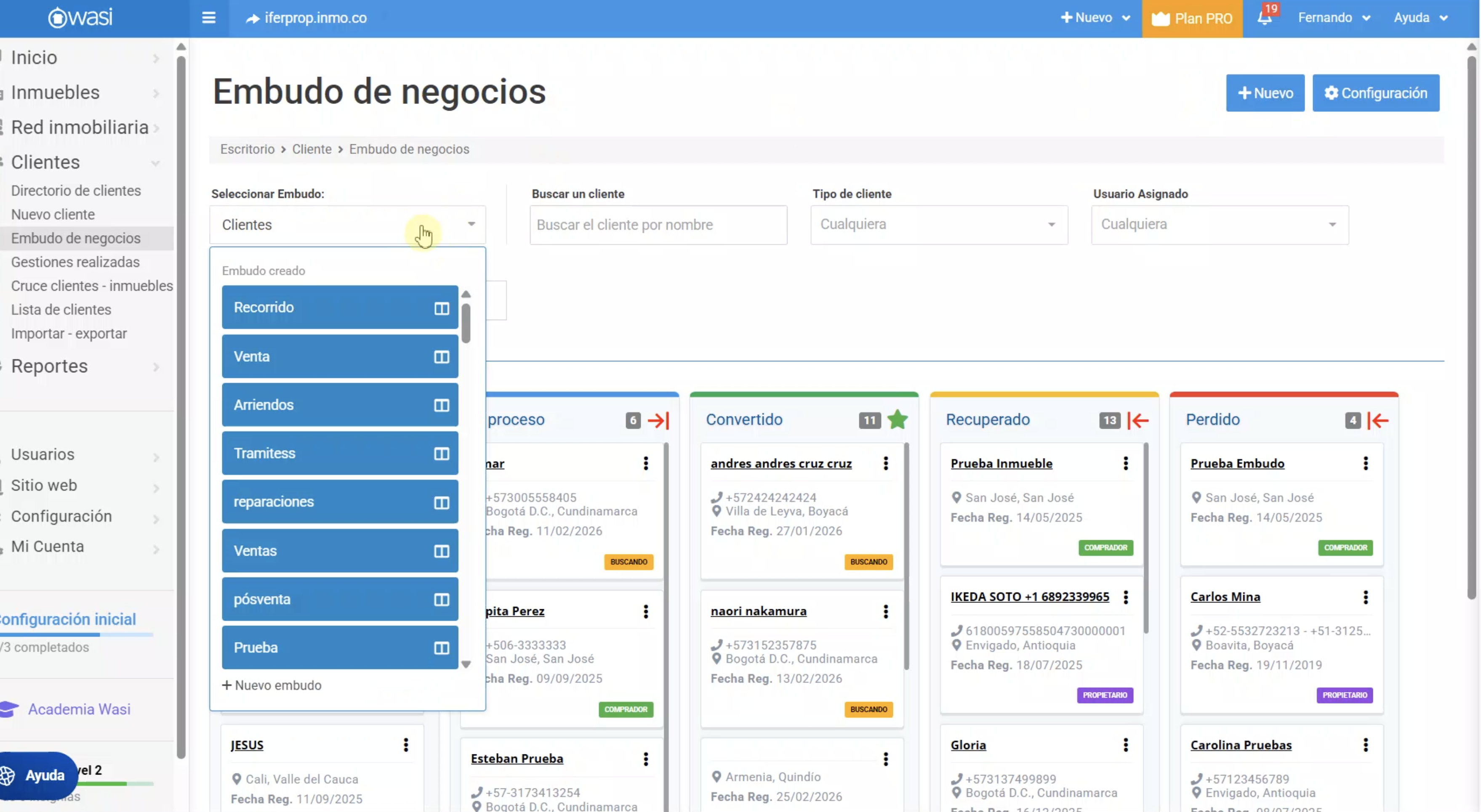 • Embudo por Defecto: Wasi trae uno inicial con etapas como Nuevo, En proceso, Convertido o Perdido. Es ideal para empezar a clasificar leads rápidos.