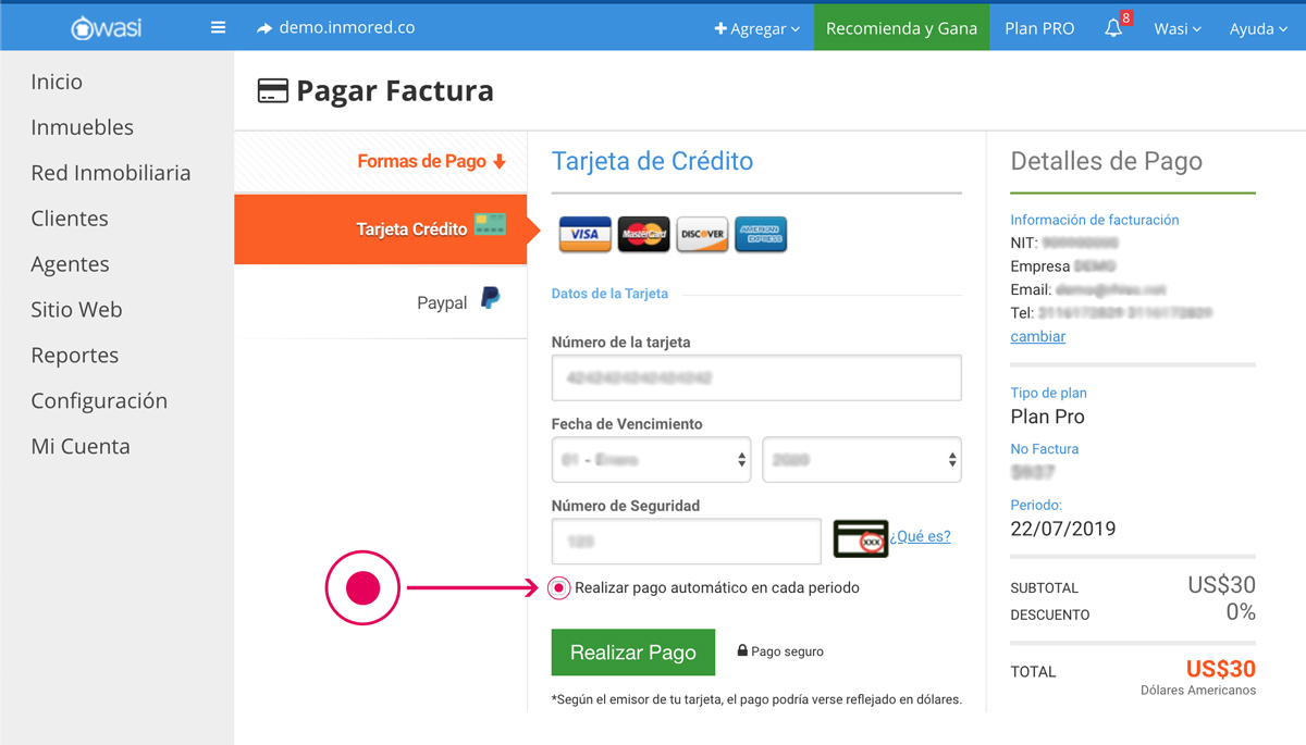 Habilitamos la función de pagos automáticos para quienes hacen pagos mensuales y no desean hacer procesos repetitivos. Al activar esta nueva mejora, no olvidarás renovar tu Plan Pro en Wasi, ya que el valor se transferirá automáticamente de tu medio de pago inscrito. No disponible para Colombia y Venezuela.