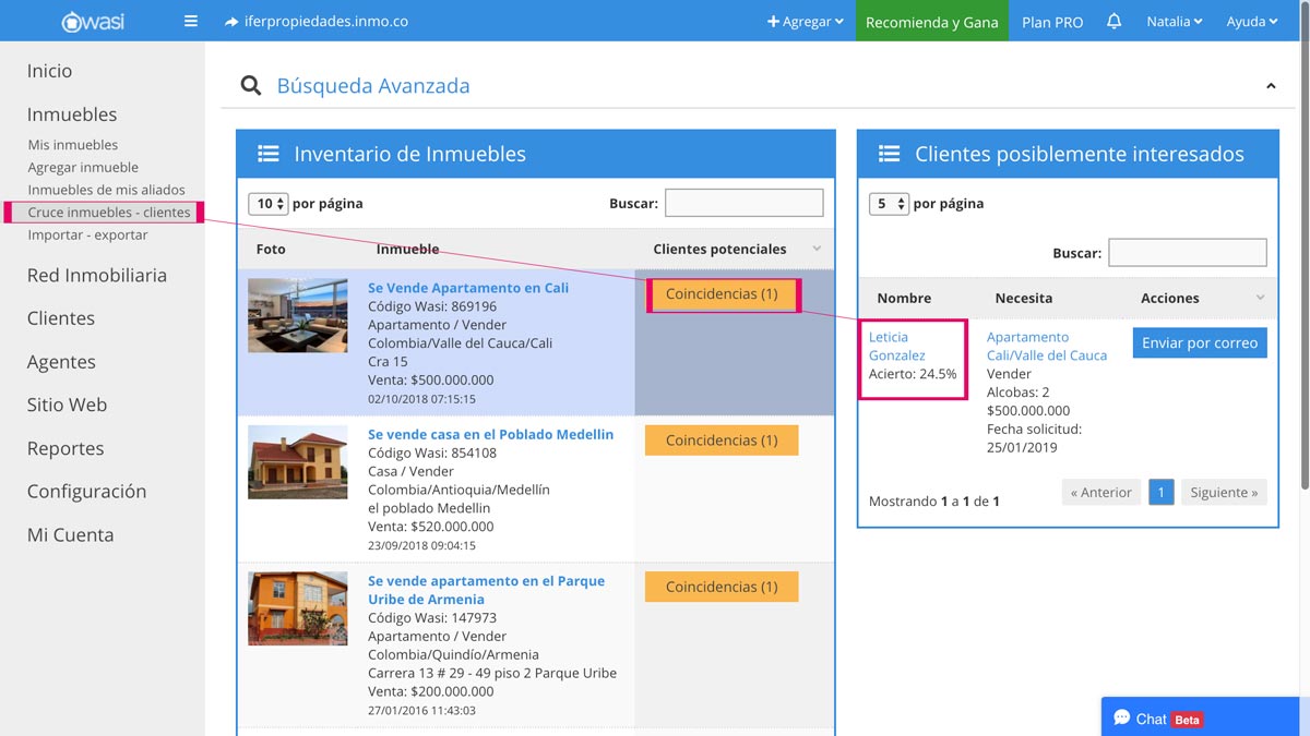 Ahora los cruces de clientes e inmuebles en nuestro CRM inmobiliario, cuentan con el porcentaje de acierto de Oferta/Demanda. Los mejores resultados de la coincidencia, aparecen teniendo en cuenta especialmente: área y precio con base en los rangos solicitados. Adicional a esto, los cruces se ordenan del más reciente al más antiguo.