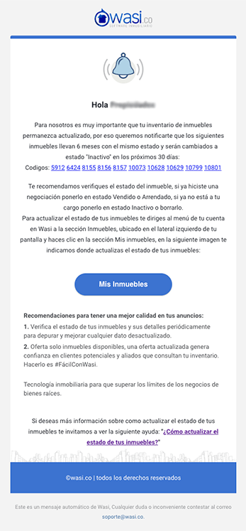 Adicionamos una funcionalidad que detecta e inactiva las propiedades que llevan 7 meses sin presentar cambios y movimientos relacionados a la oferta del inmueble. Previo a la inactivación, Wasi enviará notificación un mes antes para que revisen la propiedad. La publicación del inmueble puede ser activada nuevamente desde directorio de propiedades. Así recordarás mantener tu oferta de bienes raíces actualizada en tu página web inmobiliaria.