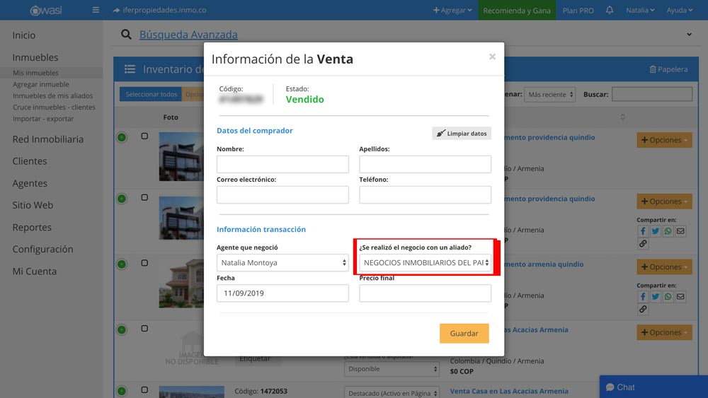 Se mejoró la interfaz de esta función y ahora permite seleccionar el detalle de si la transacción se realizó por medio de un Aliado. Puedes acceder desde Inmuebles/Mis inmuebles/columna estado/¿Está vendida o alquilada?